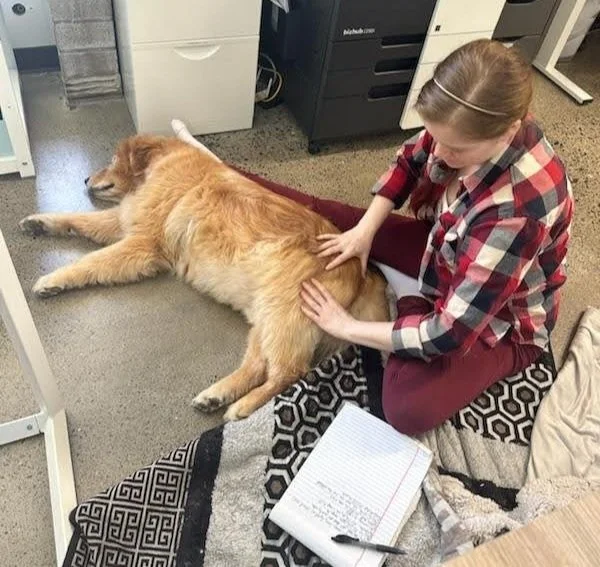 I strive to create and maintain a safe, cozy, gentle atmosphere while doing canine bodywork. There is never any push, rush, or force involved in getting a dog to “accept” massage therapy. The best outcomes require allowing the dog to dictate how the massages go. We build a trusting relationship over time, and that pays dividends in tension relief and happiness levels. Every interaction I have with these very important pooches is in service of their comfort, their benefit, and our shared safety and happiness.